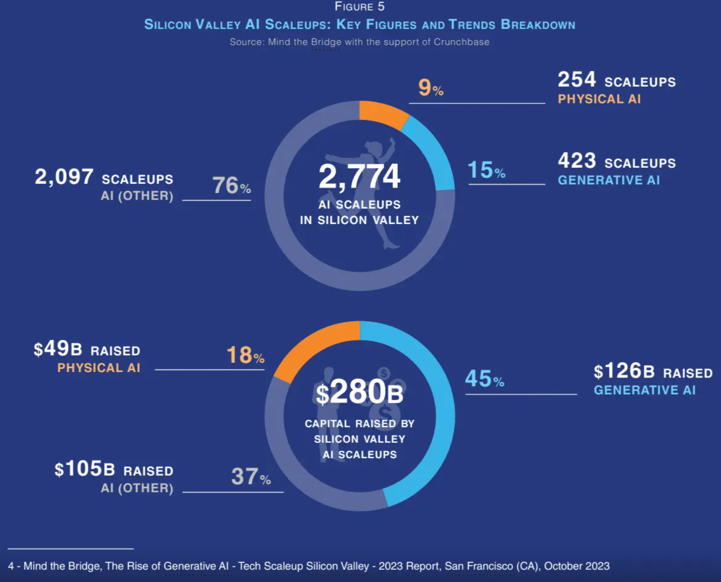 更具体地说,在AI scaleups领域,生成式AI scaleups占公司数量的15%,却占历史总投资额的45%。换句话说,硅谷在AI scaleups上的投资中,每五美元就有两美元投入生成式AI。