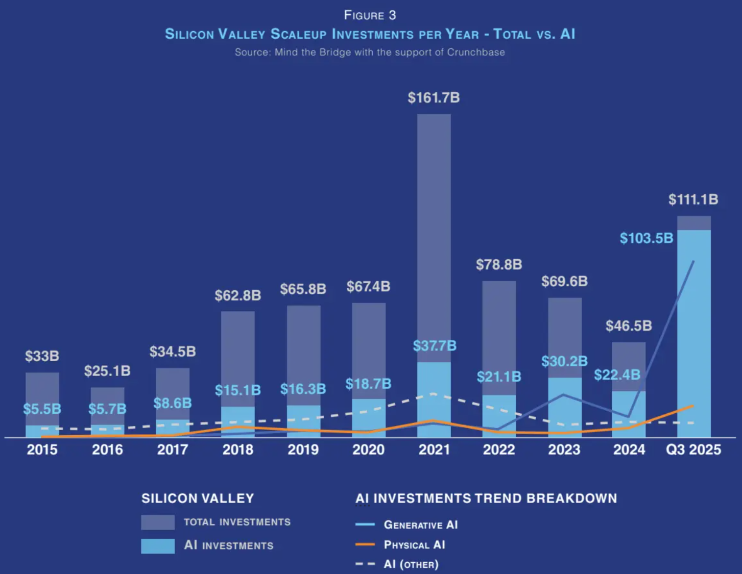 2025年,硅谷scaleup投资达到1110亿美元,仅AI就占了1035亿美元。
