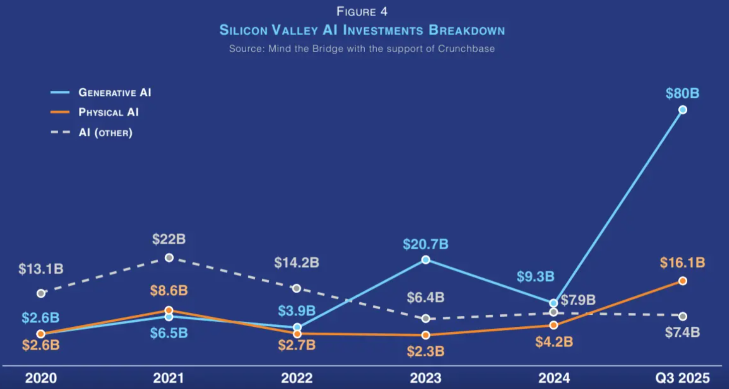 AI投资热潮:从生成式AI到物理AI的转变 硅谷正经历一场AI投资风暴,2025年科技风投中93%的资金流向AI领域。生成式AI已进入成熟期,OpenAI和Anthropic等头部企业获得巨额融资。与此同时,物理AI(融合AI与物理系统的技术)正在崛起,成为新的投资热点。2025年前三季度,该领域已吸引超160亿美元投资,涉及人形机器人、脑机接口等前沿技术。 物理AI通过将AI的认知能力与物理执行