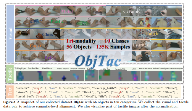 通过加入 ObjTac 数据集,这个语义对齐触觉编码器能够更好地适应实际使用的触觉传感器,并在视觉与语言语境中对触觉信号(如材质、粗糙度、硬度)进行语义对齐。