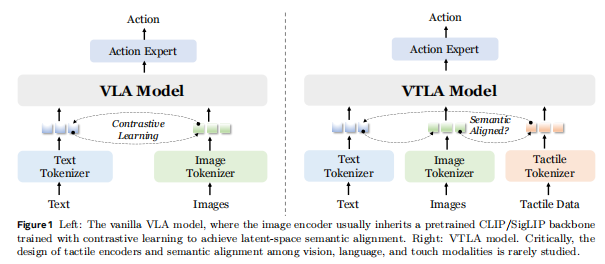 尽管 VLA 模型在开放世界泛化方面表现卓越,但其仅依赖视觉与语言,使其在需要高精度物理交互的高接触任务中表现受限。新兴的触觉增强方法尝试缓解这些限制,包括基于语言的传感器融合(Jones et al., 2025)、触觉参与的 VLA 学习(Hao et al., 2025; Zhang et al., 2025b)以及低维度力觉增强控制(Huang et al., 2025; Yu et al., 2025)。然而,这些方法尚未充分探索触觉编码器的设计。