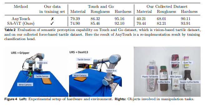 尽管已有工作(Feng et al., 2025)探索了视觉-触觉传感器的统一表示,但其方法难以推广到基于力的触觉感知。如表 2 所示,预训练的 AnyTouch 编码器在基于力的数据集上仅取得 40.21% 的材质分类准确率,显示出严重的跨传感器迁移限制。