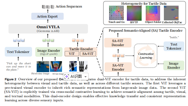 为弥补这一缺口,我们提出 OmniVTLA(Vision-Tactile-Language-Action Model),一种将视觉、触觉与语言统一到共享语义空间中的新型架构,如图1所示。VTLA 利用对比学习将高分辨率触觉信号与视觉和语言概念进行对齐,使机器人能够在“看到什么”和“被要求做什么”的语境下“理解自己触摸到了什么”。具体来说,我们提出了一条用于触觉数据的双编码器路径,以应对模态异质性,其中包括一个预训练视觉 Transformer(ViT)以及一个语义对齐的触觉 ViT(SA-ViT)。其次,我们构建了 ObjTac 数据集,涵盖 10 类共 56 个物体的文本、视觉与基于力的触觉数据,总计 135K 三模态样本。第三,我们利用跨传感器数据训练了一个语义对齐的触觉编码器,以学习统一的触觉表示,并作为 OmniVTLA 的更优初始化。