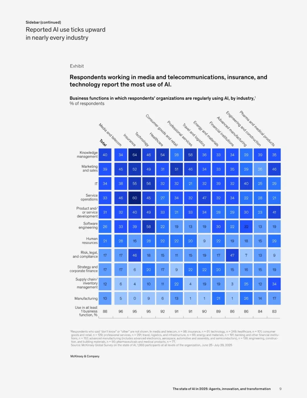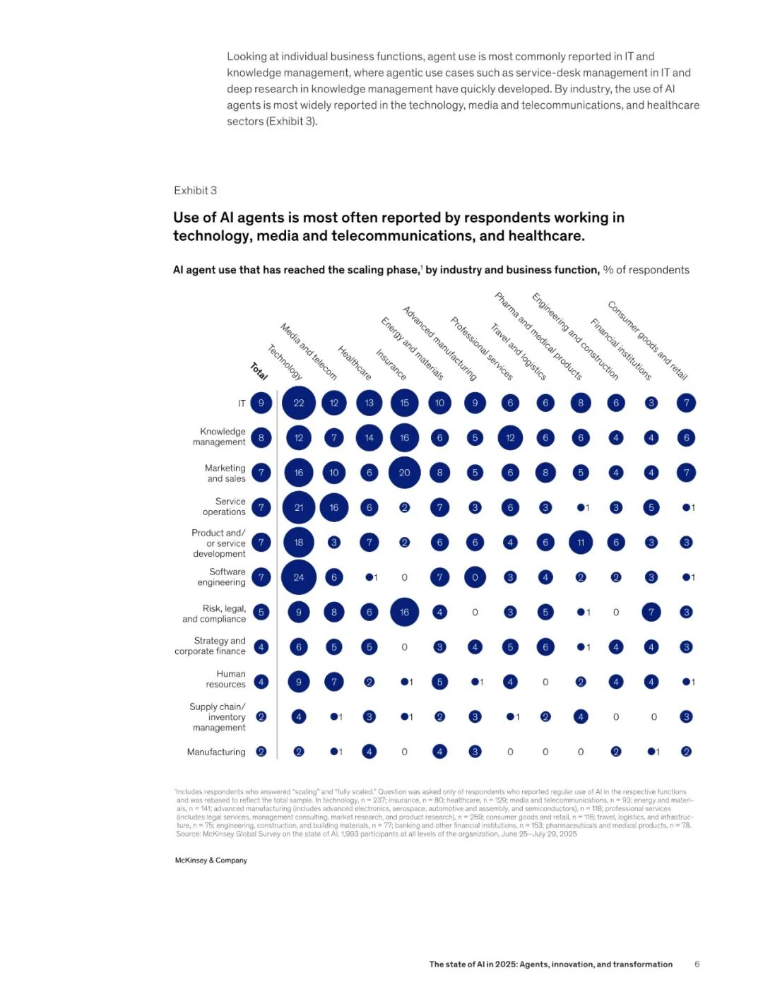 麦肯锡在今年 11 月,最新发布了关于 2025 AI 市场的调研报告 ——《The state of AI in 2025:Agents, innovation, and transformation》。报告的六大核心发现报告调查了全球 105 个国家,共 1993 名受访者,得出以下六大关键发现: