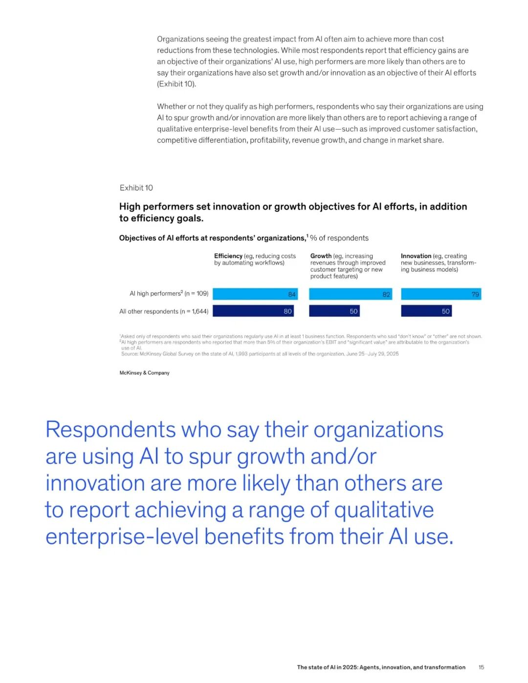 80% 的企业将提效作为使用 AI 的目标,但是真正从 AI 的应用中获得较大商业价值的 AI “领跑者”企业,往往同时还将业务增长或产品创新设为核心目标。