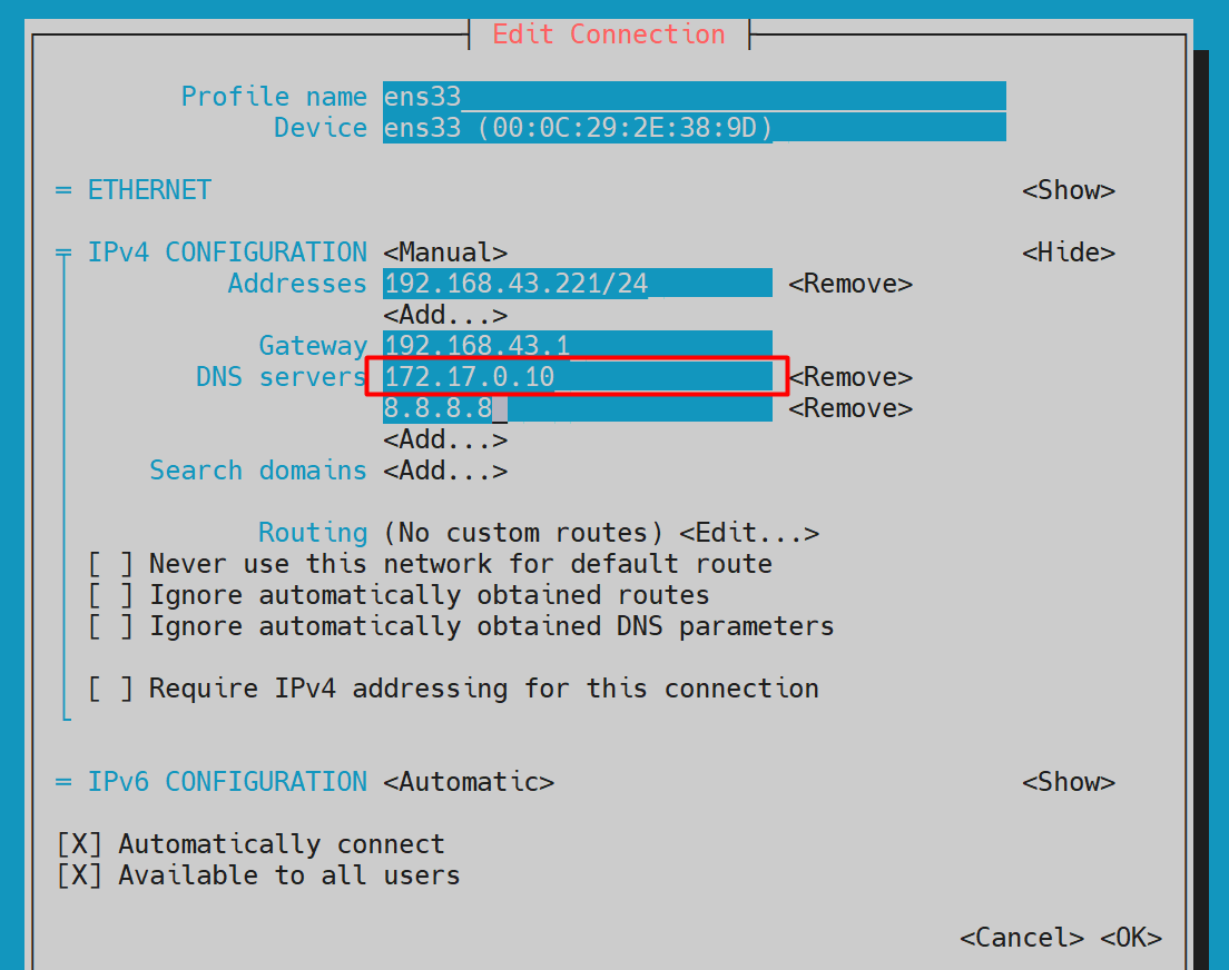 在节点机器Node上,如下Network Manager的界面中,DNS servers可以有多个,将其中第一个地址设置为上个命令获得的:DNS服务IP(在本环境中为172.17.0.10)。
