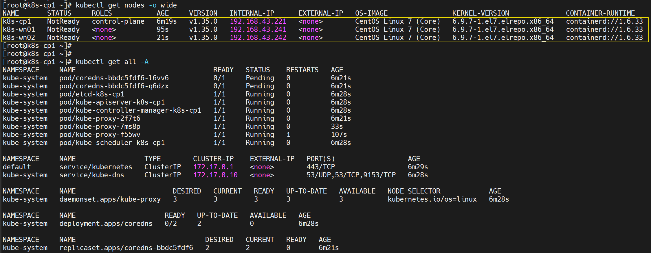 注意:此时集群已经建立完毕,并能看到各个节点。但各节点STATUS的为NotReady。因为Kubernetes不会自动安装CNI网络插件,且在前文安装Containerd时也未安装CNI插件。此时通过kubeadm构建的集群目前还不具备网络功能。在安装CNI网络插件之前,任何Pod(包括Kubernetes自带的CoreDNS)都无法正常工作。