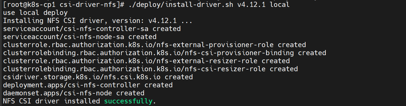 下面选择NFS CSI driver为例进行说明。NFS CSI driver可①在线联网安装 或 ②通过clone git仓后本地安装,具体安装见csi-driver-nfs官网:https://github.com/kubernetes-csi/csi-driver-nfs/blob/master/docs/install-nfs-csi-driver.md