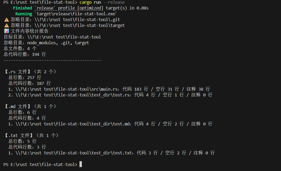 # 4. 基础使用(统计当前目录的 .rs/.md/.txt 文件)