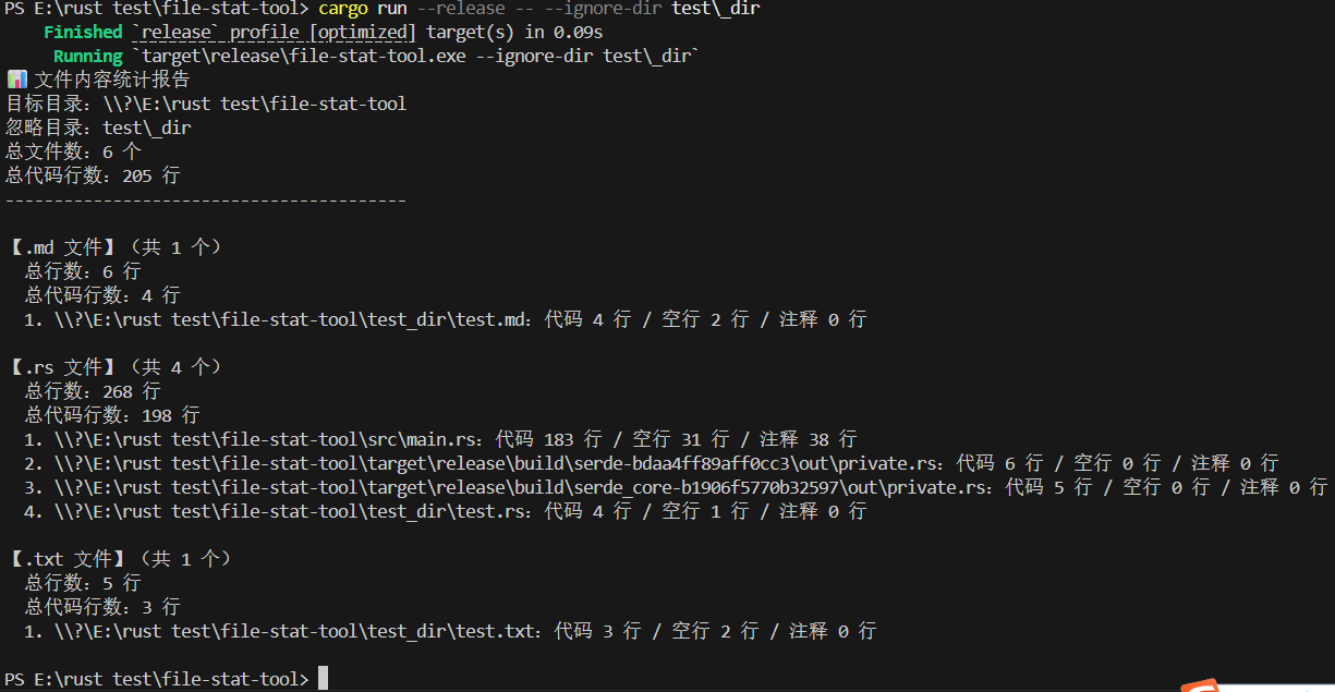 .rs、.md、.txt)分类统计 - 支持忽略指定目录(如