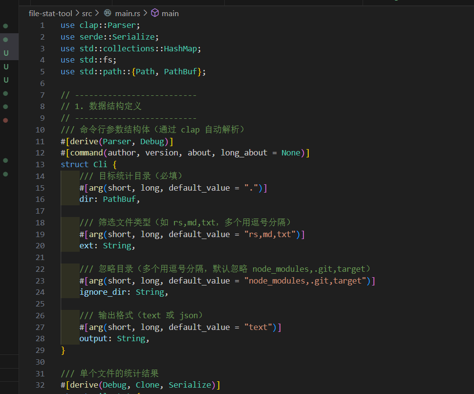 └── main.rs # 核心逻辑(参数解析、文件遍历、统计计算、报告生成)