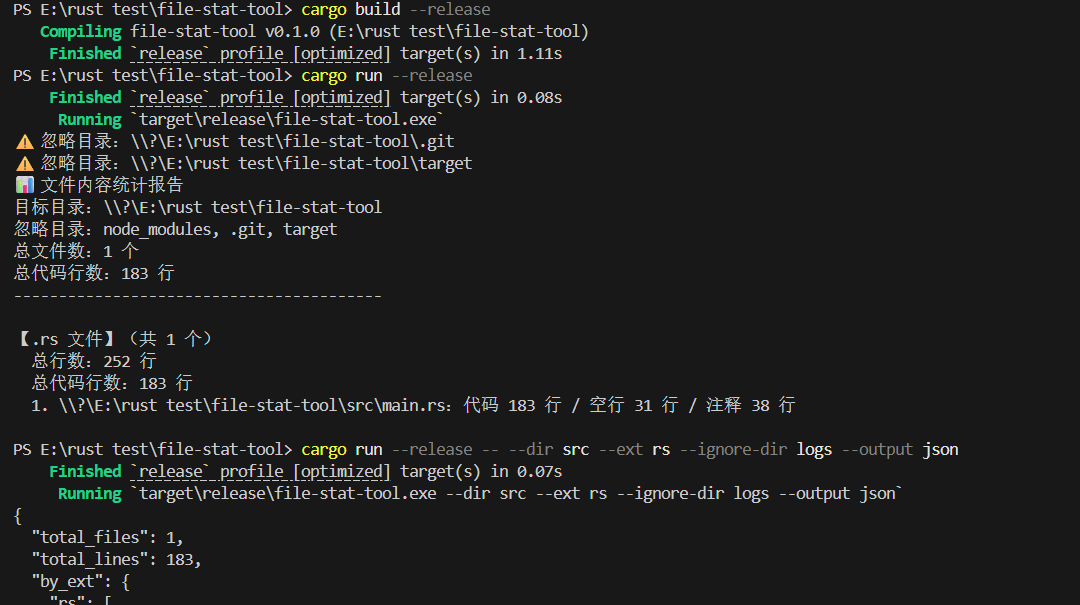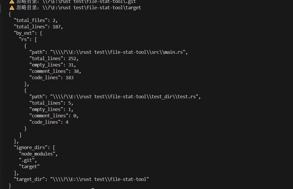 2. 自定义筛选测试(仅统计 Rust 文件,输出 JSON 格式)