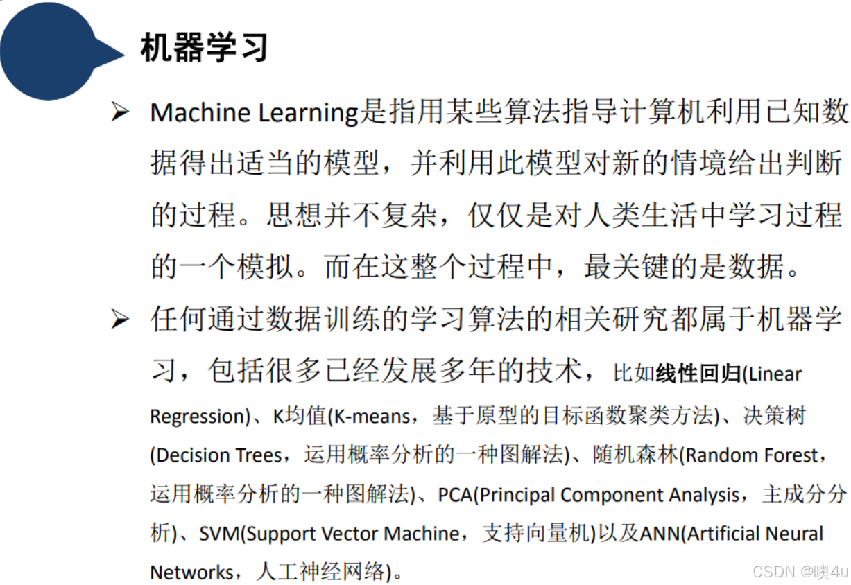 看似有些拗口和抽象,实则就是通过计算手段,将对于我们人类来说是经验、对于计算机来说是数据的东西,用来改善系统自身的性能,这就是机器学习算法。