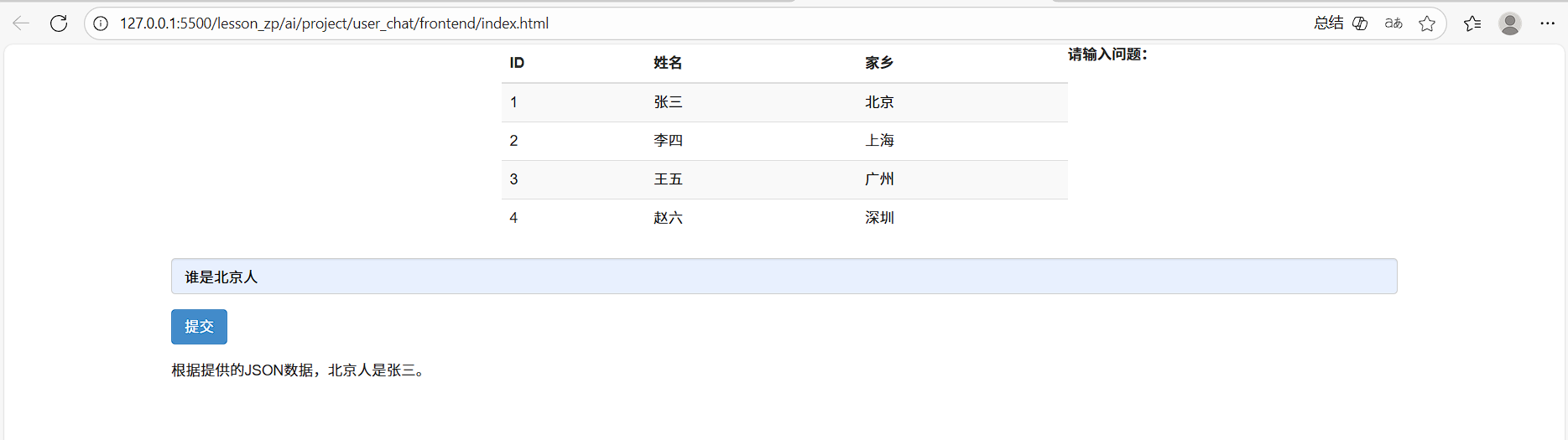 用户在页面输入自然语言问题(如“谁是北京人?”),系统自动调用本地用户数据,并通过大模型(LLM)理解问题、分析数据并返回答案。