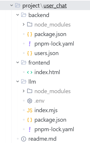 # 终端1:在后端启动模拟数据服务 npx json-server --watch users.json --port 3001 # 终端2:在llm文件夹终端启动AI服务(需先配置 .env) node index.mjs # 浏览器打开 index.html 即可使用