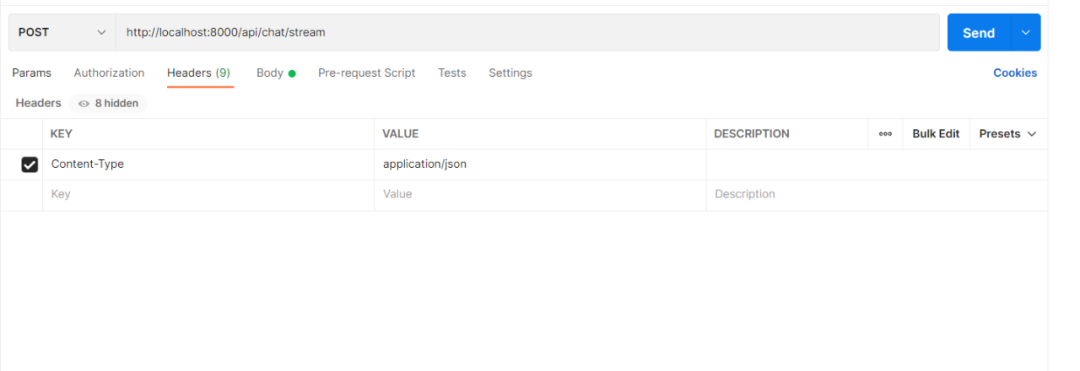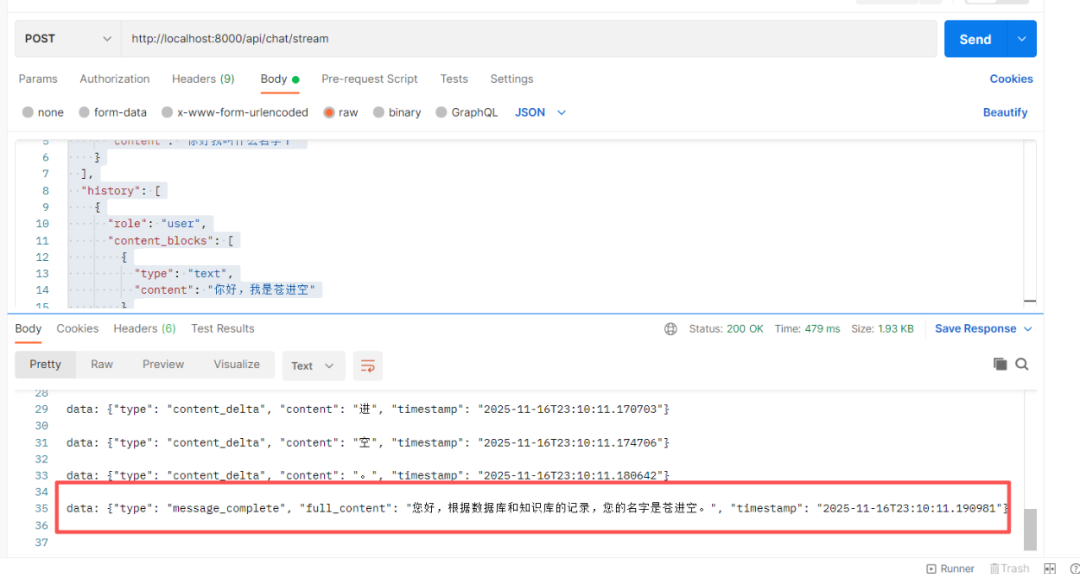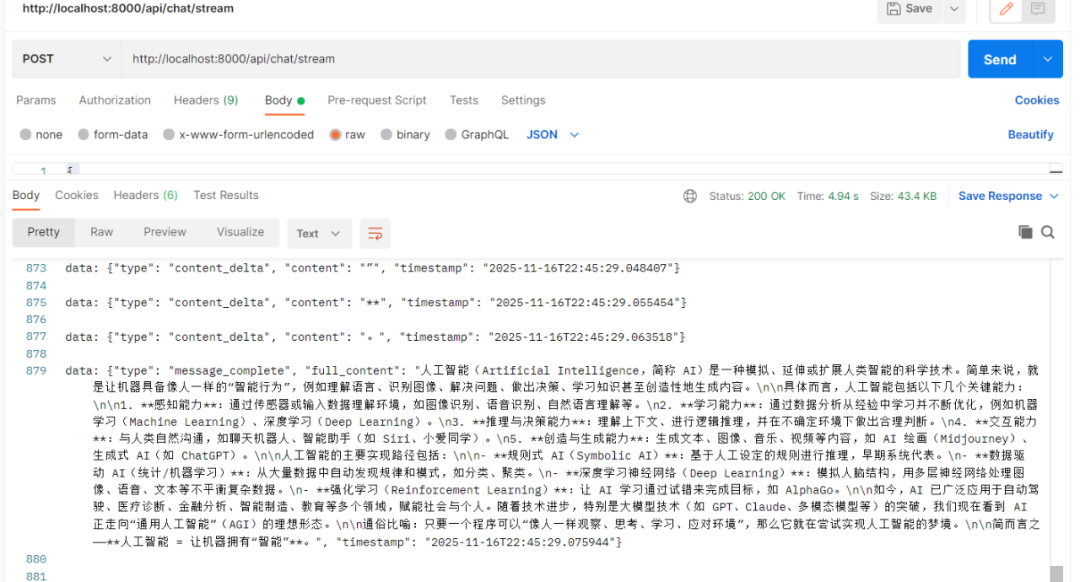 - 在 Body 中填入测试数据,验证基础问答功能,点击 Send 发送请求后,Postman 将展示流式响应效果: