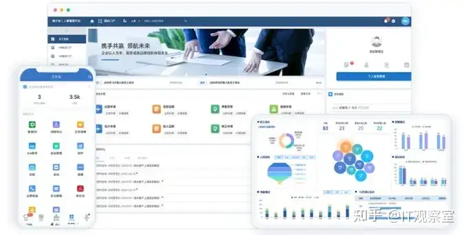 核心功能:覆盖组织管理、招聘管理、培训管理、薪酬绩效、排班考勤、入转调离等人事全过程,贯通人事、财务、业务数据,提供可视化人事报表支撑。