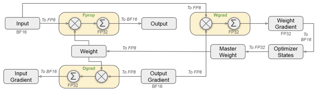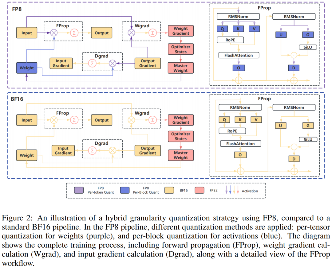 图的逻辑和本文上面混合精度训练图类似,在不同的地方分别用到了BF16、FP32、FP8。
