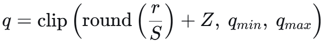 clip:钳位函数/裁剪函数,clip(x, a, b)将x限制在[a, b]之间,是为了避免量化后的整数超出其表示范围,例如clip(200, -128, 127)=127。