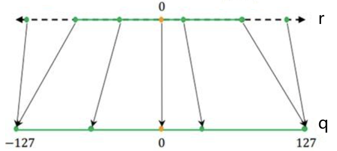 量化是把高精度数据映射到低精度的过程。如下图1,上面r表示原始高精度值,例如FP32,下面表示量化映射到INT8精度,范围是[-128,127]。
