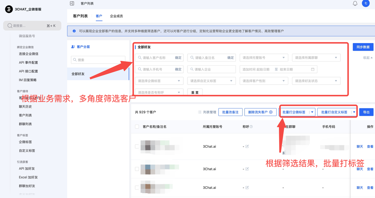 3Chat.ai可以筛选的角度很多,企业可以充分根据自己的业务需求进行批量打标签操作。