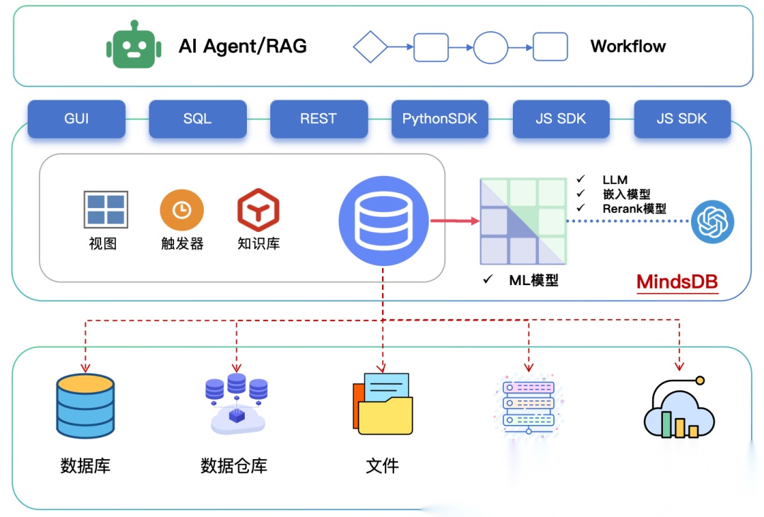 一个跨多数据源(数据库、文件、应用等)、支持多AI模型(传统ML/LLM模型、嵌入模型)的统一数据连接、查询与智能应用的"中间件”。