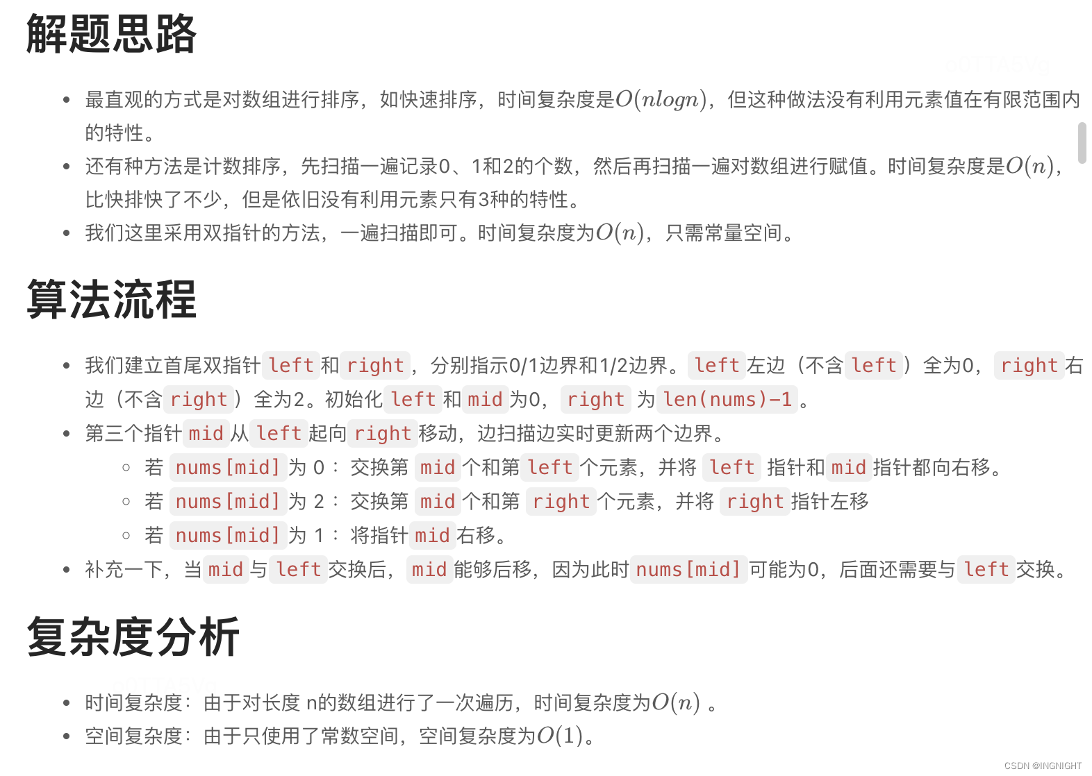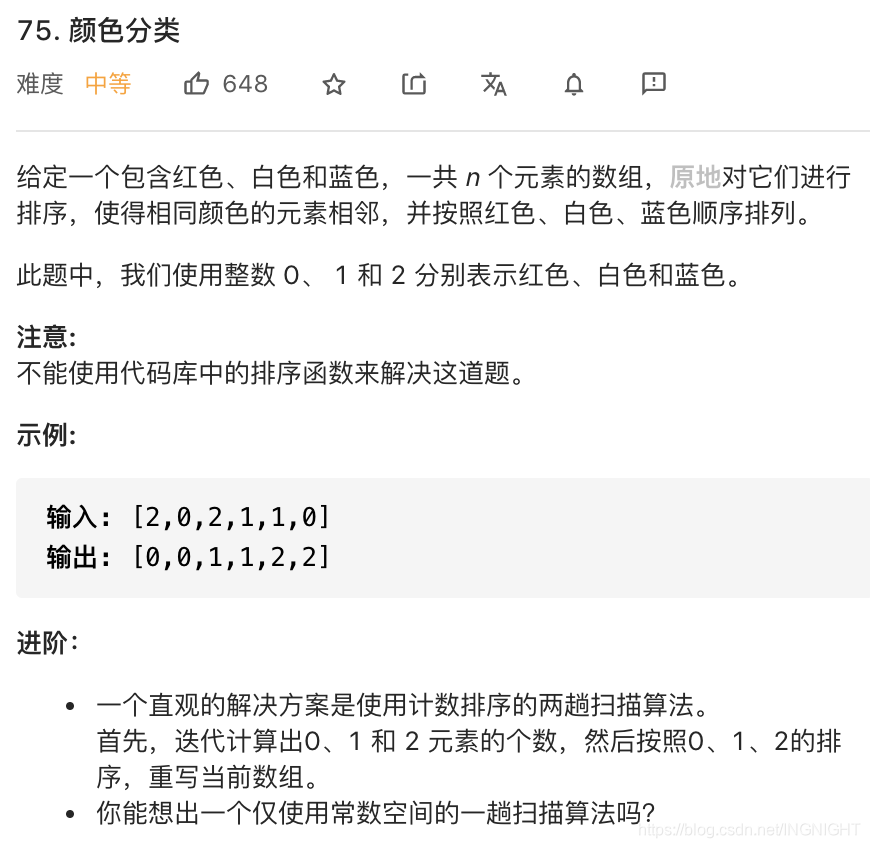 题解:https://leetcode-cn.com/problems/sort-colors/solution/kuai-su-pai-xu-partition-guo-cheng-she-ji-xun-huan/一句话题解:做对这道题需要熟悉快速排序的 partition 过程。说明:使用库函数排序和手写计数排序都可以完成这道问题,这里省略。什么是 partition ?我们在学习 快速排序