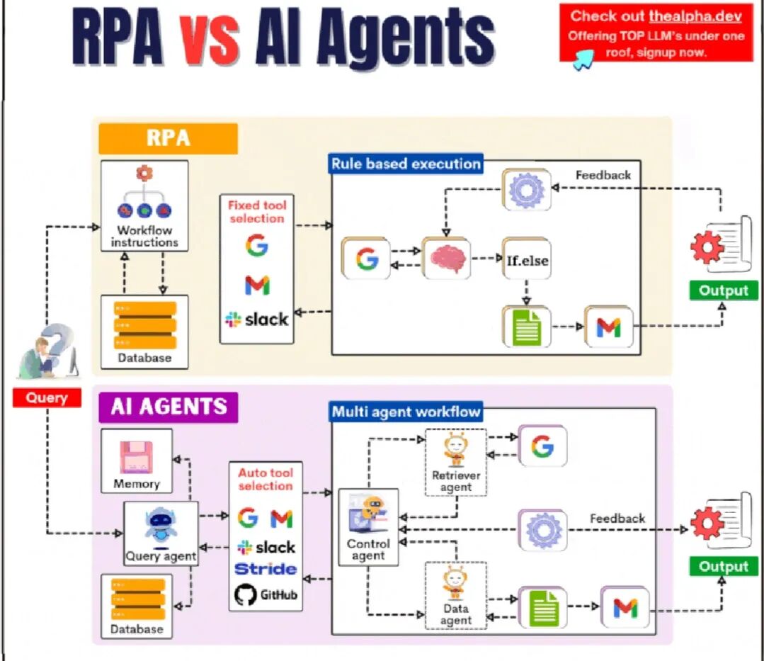 RPA的决策逻辑是线性的,主要通过“如果-那么-否则”(if-else)等规则进行判断。它根据事先定义的业务逻辑流,自动点击、输入、复制和粘贴数据,完成重复性、高频次的任务。这一过程是确定性的,每一个步骤都必须被清晰地定义。虽然RPA流程中可以引入对外部系统(如Google或特定模型)的调用来获取信息,但其整体反馈(Feedback)和流程控制依然牢牢掌握在固定的规则框架内。RPA产出的是高度可预测且标准化的输出。