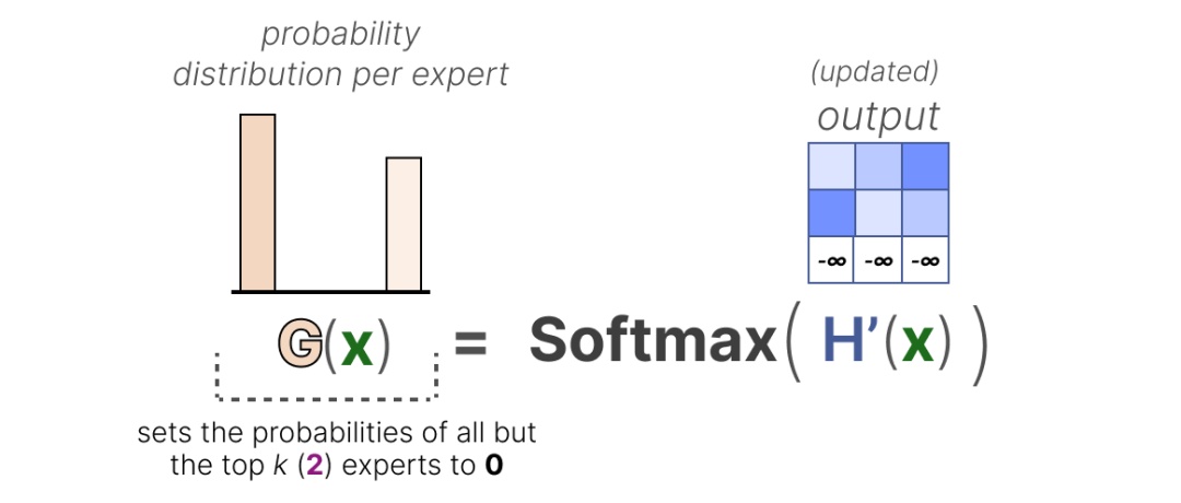 - 强制选择 Top-k 专家:将非 Top-k 专家的分数设为,使得这些专家在 SoftMax 计算中概率为 0,无法被选中: