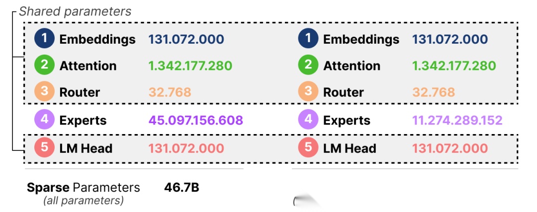 - 共享参数:embedding 层(131M)、注意力层(1.34B)、路由器(32K)、LM Head(131M);