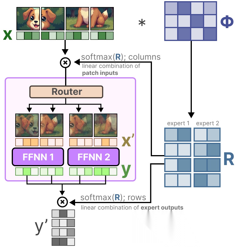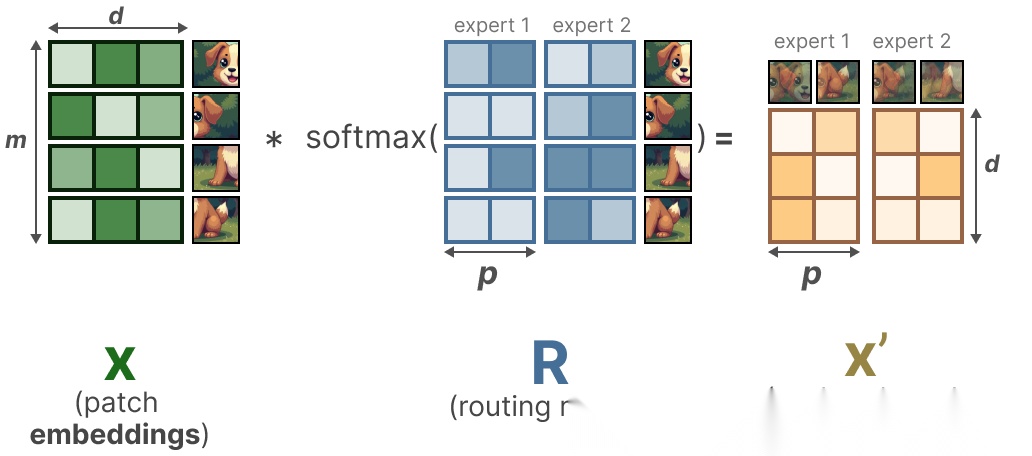 patch 混合:将输入 patch 的 embedding 矩阵(维度为,为 patch 数量)与可学习矩阵(维度为)相乘,得到路由矩阵(维度为,为专家数量),表示每个 patch 与专家的关联程度;