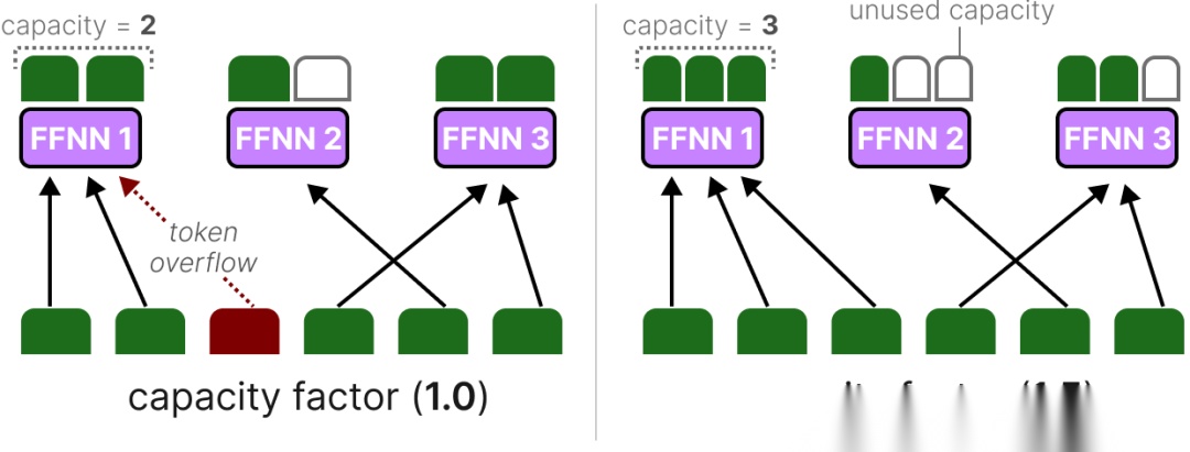 若所有候选专家均达到容量上限,剩余 token 将跳过当前 MoE 层,直接进入下一层(称为 Token Overflow)。为减少溢出对性能的影响,通常需合理设置容量因子:过大会浪费算力,过小会导致大量溢出。
