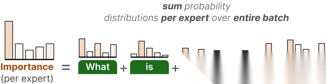 对一个训练批次(batch)中的所有 token,统计每个专家被选中的概率总和,作为该专家的 “重要性分数”: