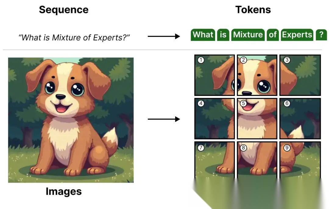 ViT(Vision Transformer)的核心思想是 “将图像切分为 patch(图像块),并将 patch 视为‘视觉 token’,采用与文本 Transformer 相同的方式处理”。这一特性使得 ViT 与 MoE 的融合极为自然: