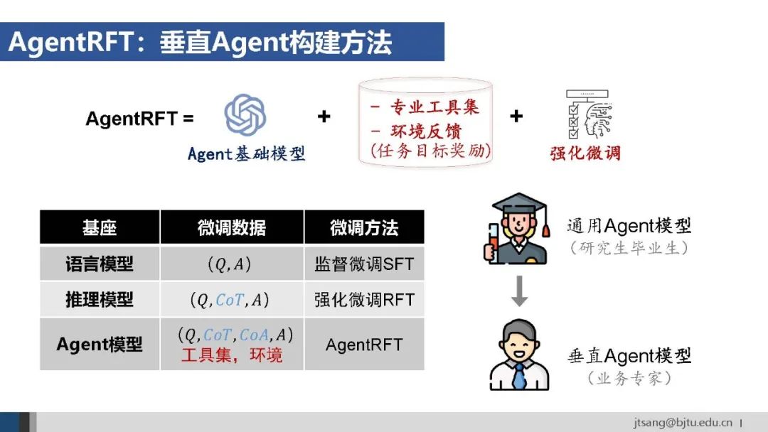 对o3等agent基础模型微调获得垂直agent的通用公式是:准备完成任务所需的专业工具集、受控环境内可验证的任务目标,然后进行强化微调。