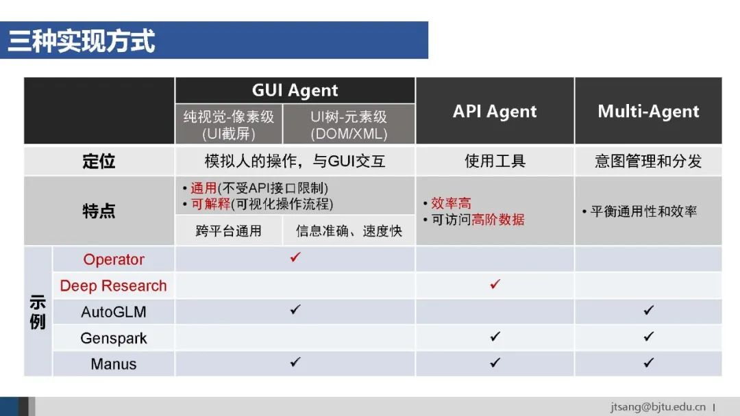 实现方式上包括GUI Agent、API Agent和多Agent三种。