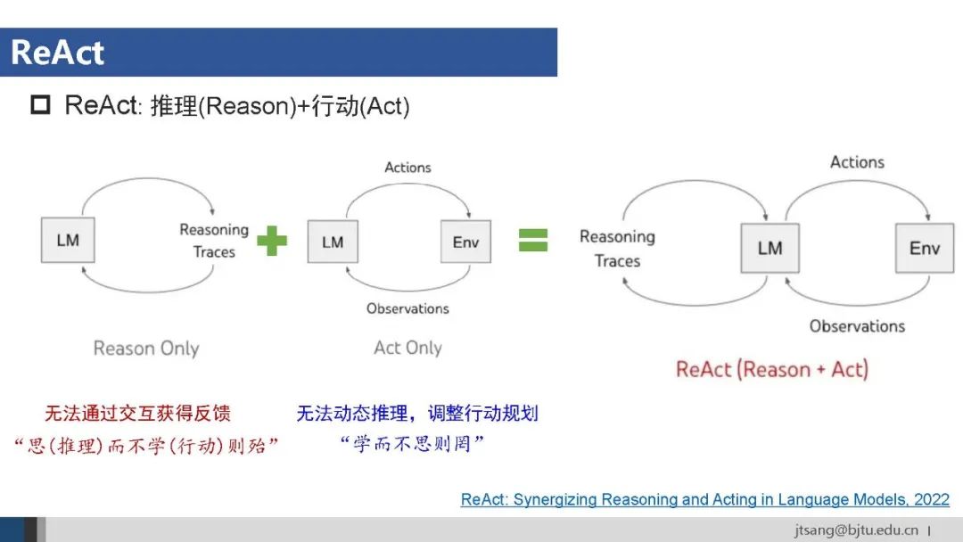 与LLM和推理模型的人-模型二元结构不同,agent模型要求能够同时进行思考与行动,形成了由人、模型和环境构成的三元结构:使用工具与环境进行交互以获得反馈,经过多轮的思考、行动和观察后,最终生成回复。