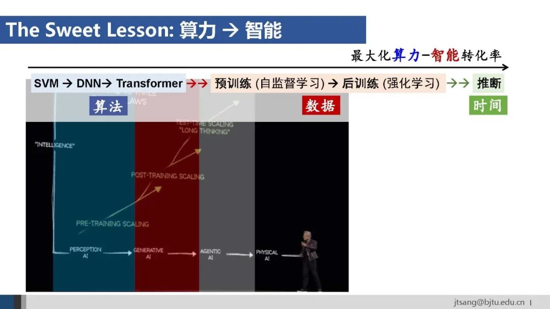 随着算力每年增长4-5倍,近十年的算力已经提升了百万倍。当算力资源成为主要的推动因素,AI发展的一条暗线是:如何将越来越多的算力以最高的效率转化为智能的提升。