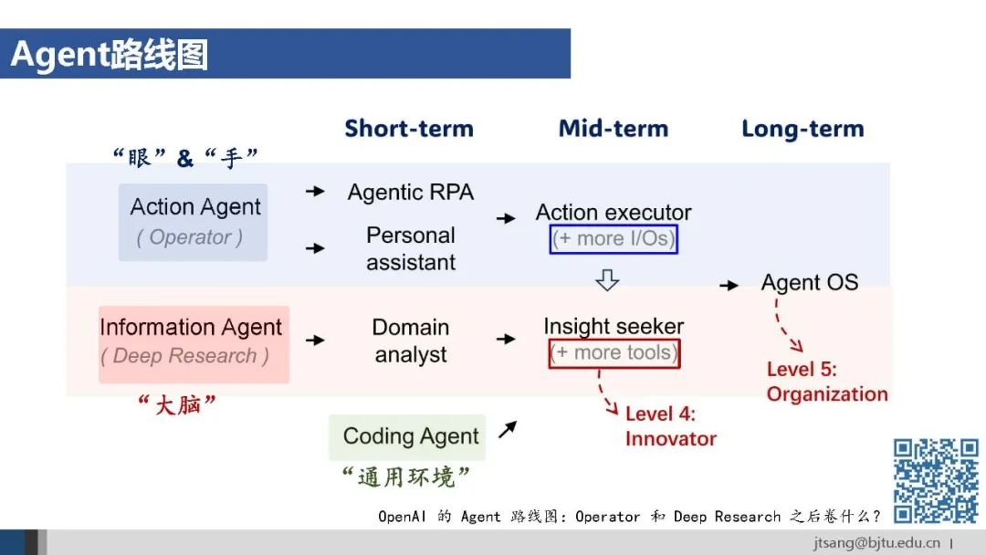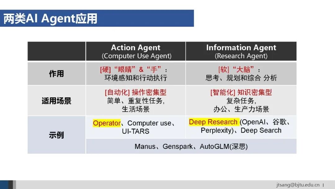 Operator和Deep Research代表了目前AI Agent的两个主要应用方向:操作action agent和信息information agent。