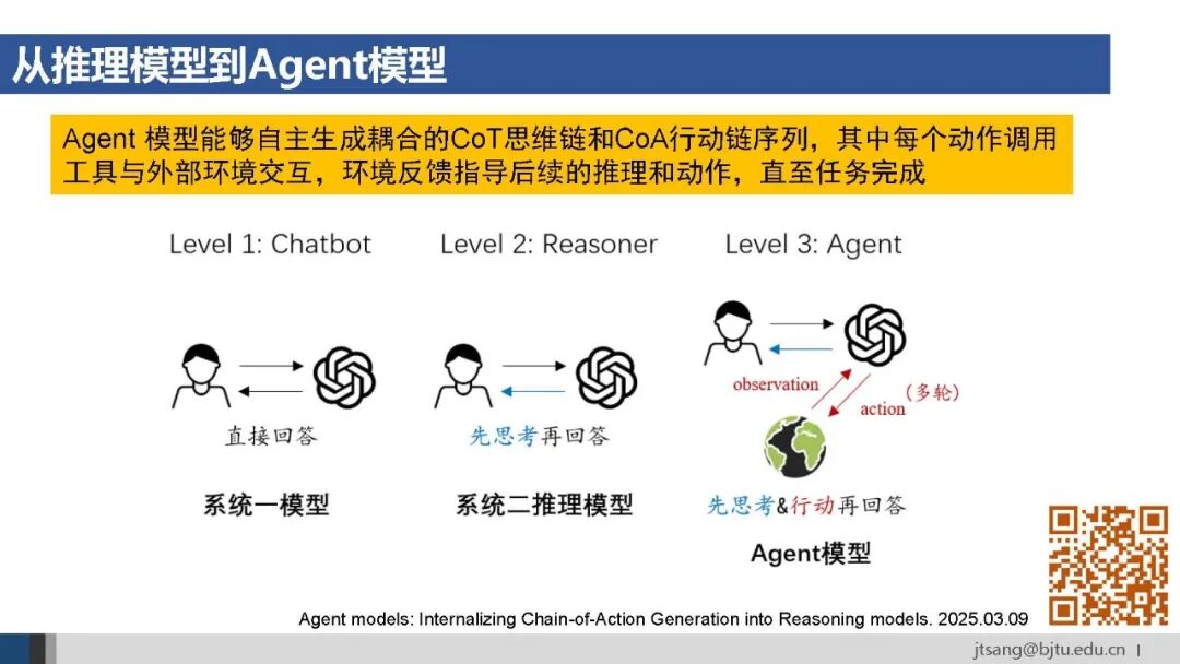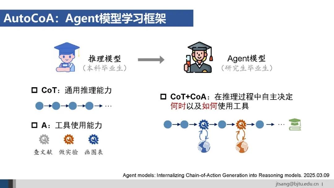 推理模型已经具备了通用推理能力和单点的工具使用能力。Agent模型训练旨在面向任务目标,端到端训练模型在推理过程中的链式工具使用能力。