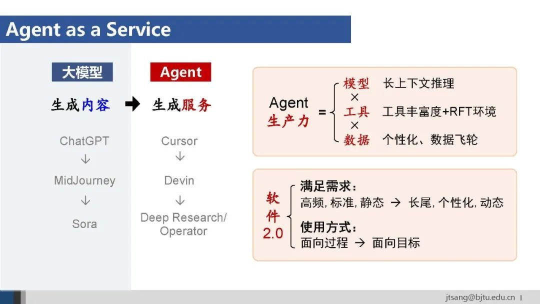 Agent的生产力由模型智能、工具多样性和数据专业性三个因素决定。应用层不仅要承接最新模型成果,还需要从工具和数据两个方面向下优化模型。