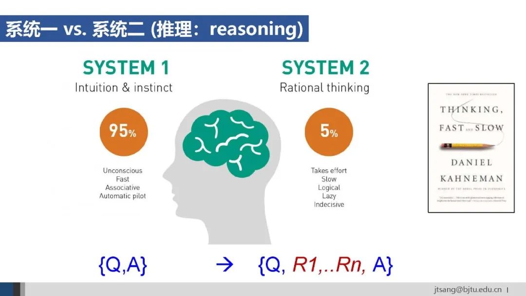任务规划与人类的系统二能力紧密相关。按照心理学理论,系统一代表直觉,从Q直接到A,属于“快思考”;系统二从Q到A之间增加了多步的逻辑推理,属于“慢思考”。