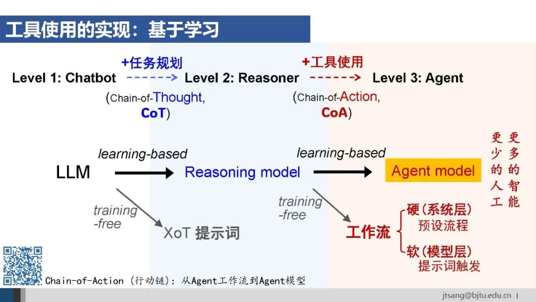 将预设流程和提示词触发两种方式统称为工作流。根据“更少的人工,更多的智能”的原则,基于学习得到的Agent模型应该具有更高的上限。