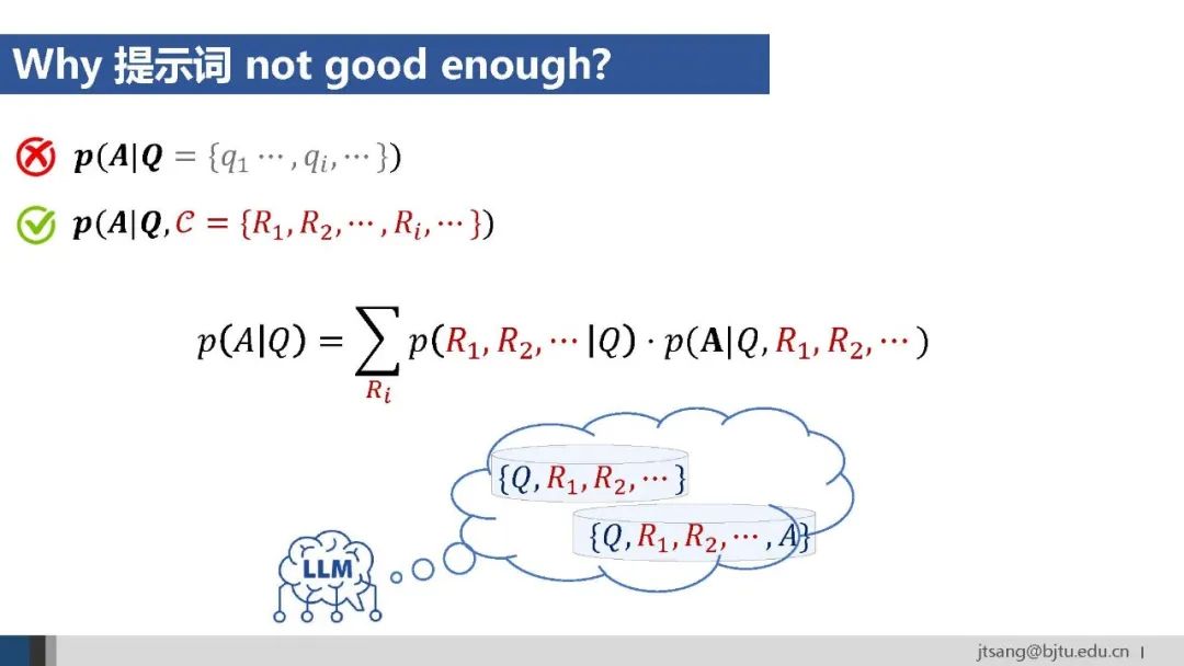 然而,互联网语料主要是 (Q, A) 的形式,这意味着自注意力中学到的上下文关联是在问题和答案之间的。而推理需要捕捉推理过程和答案之间的关联。在推理过程上将p(A|Q)展开后,可以看得很清楚。