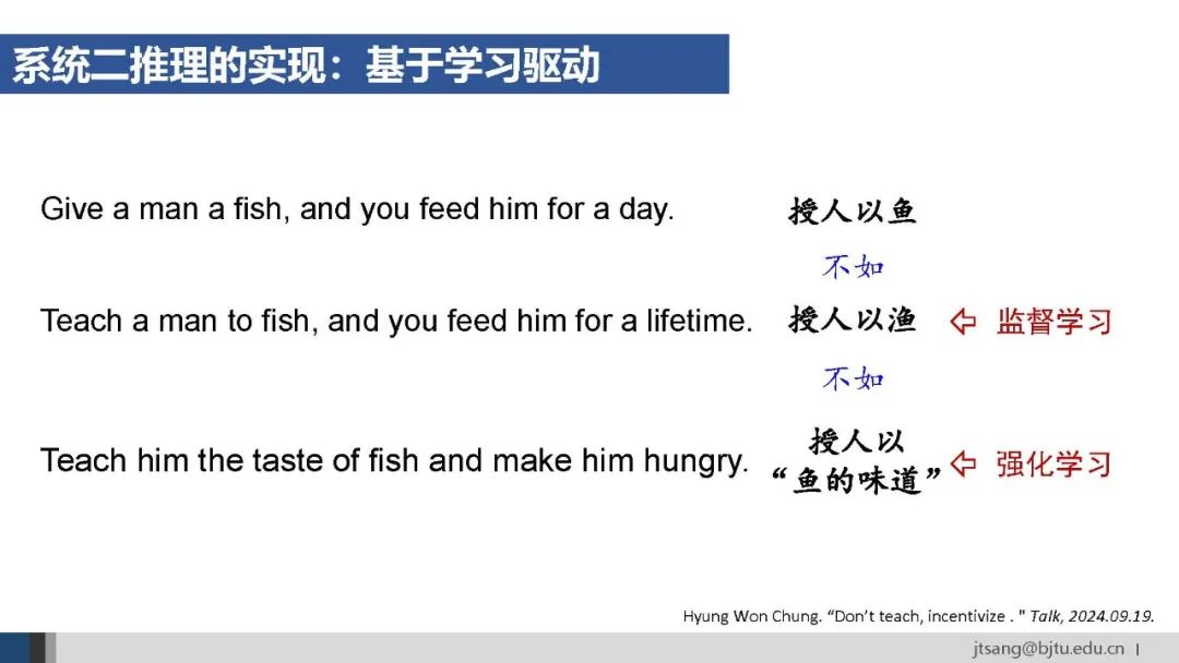 主要有监督学习和强化学习两种学习路线。监督学习类似师傅手把手教徒弟,像是大学之前的通识教育,提供标准解法和完整步骤。