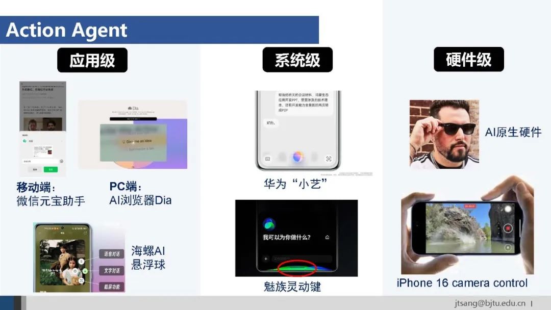Action agent目前主要在各类终端上。Agent入口的层级从高到低有应用级、系统级和硬件级。