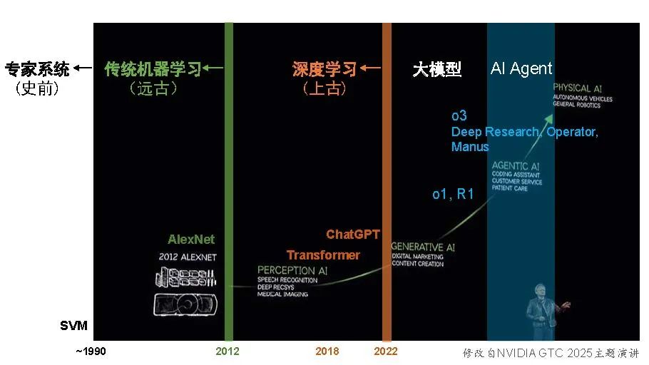黄仁勋在英伟达GTC2025的主题演讲中回顾了AI过去十几年的发展。从2012年AlexNet开始的深度学习,到近几年大模型推动的生成式AI,再到当下正经历的Agentic AI,直到未来的Physical AI。