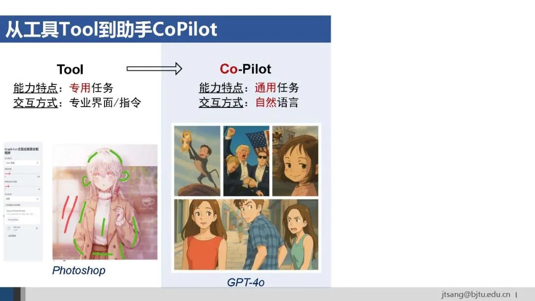在大模型之前,以专家系统、传统机器学习和传统深度学习为代表的AI,依赖专业界面和指令,解决专用任务。比如用Photoshop进行交互式抠图。这一阶段的AI和人类历史上每次技术革命一样,提供的是被人类使用的工具。