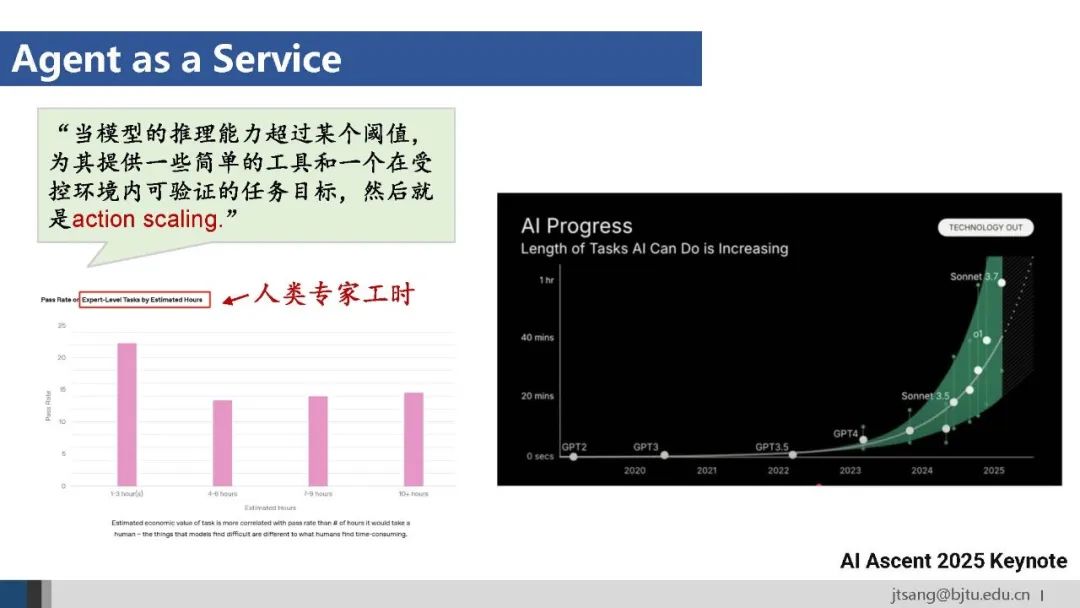 AI Agent是这一线索的延续:在推断阶段,用更多时间消耗更多算力,进一步提升智能水平。