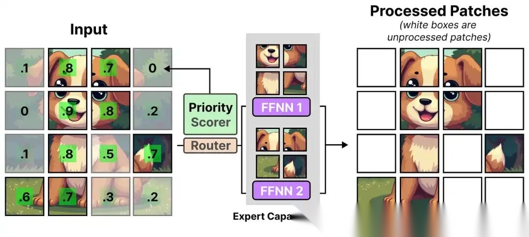 图像处理的特殊挑战是:图像 patch 数量多(一张 224×224 图像切分为 16×16 patch 后,共 196 个 patch),若每个专家容量过小,会导致大量重要 patch 被丢弃。